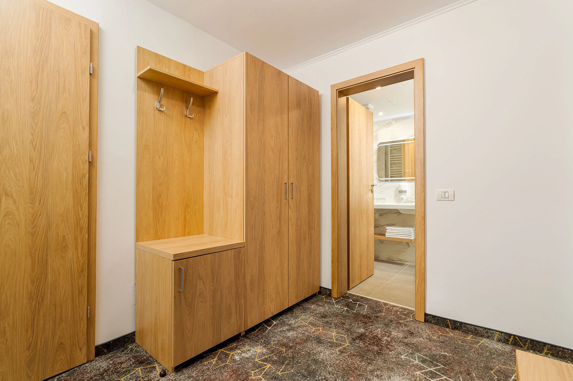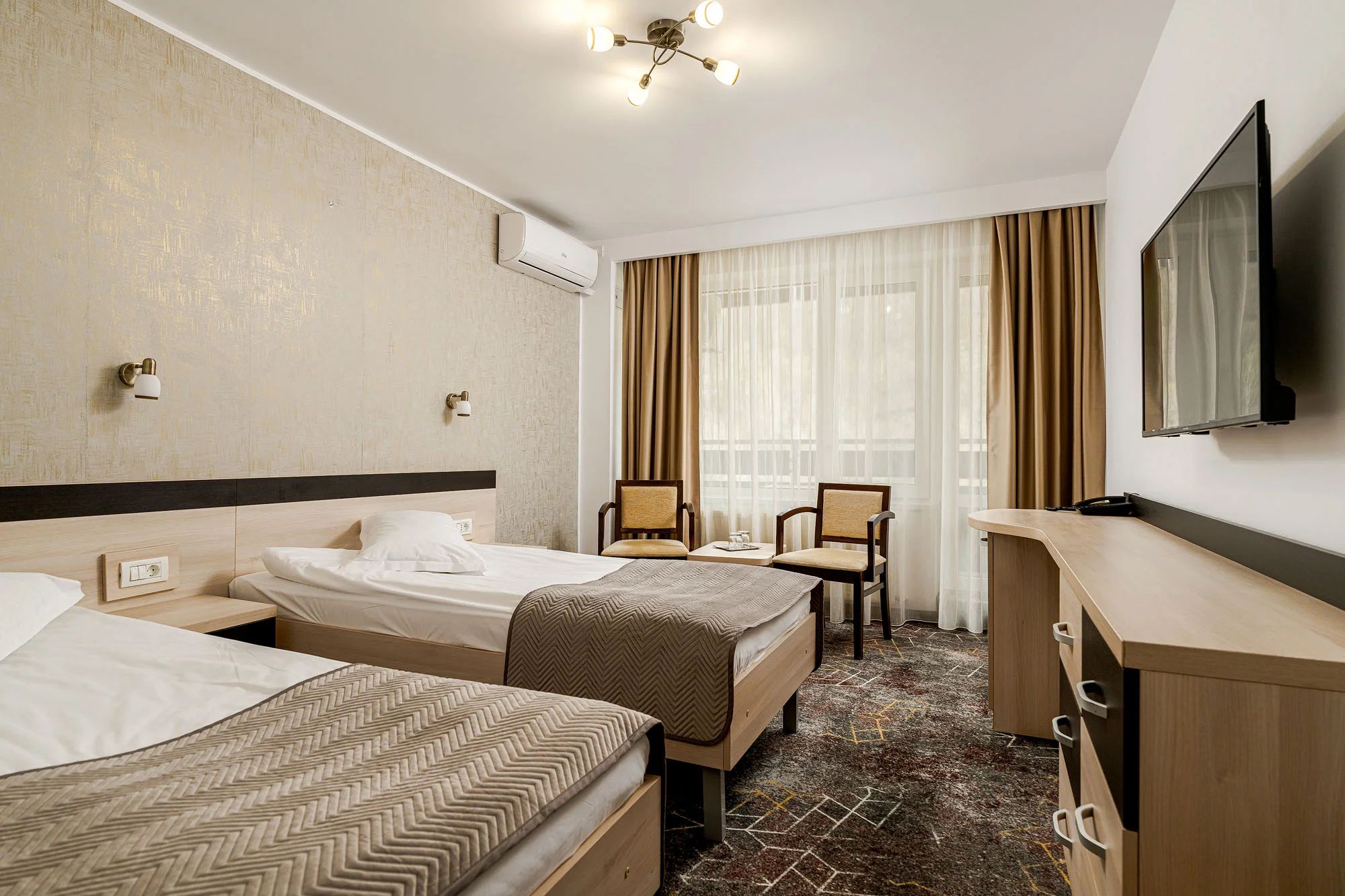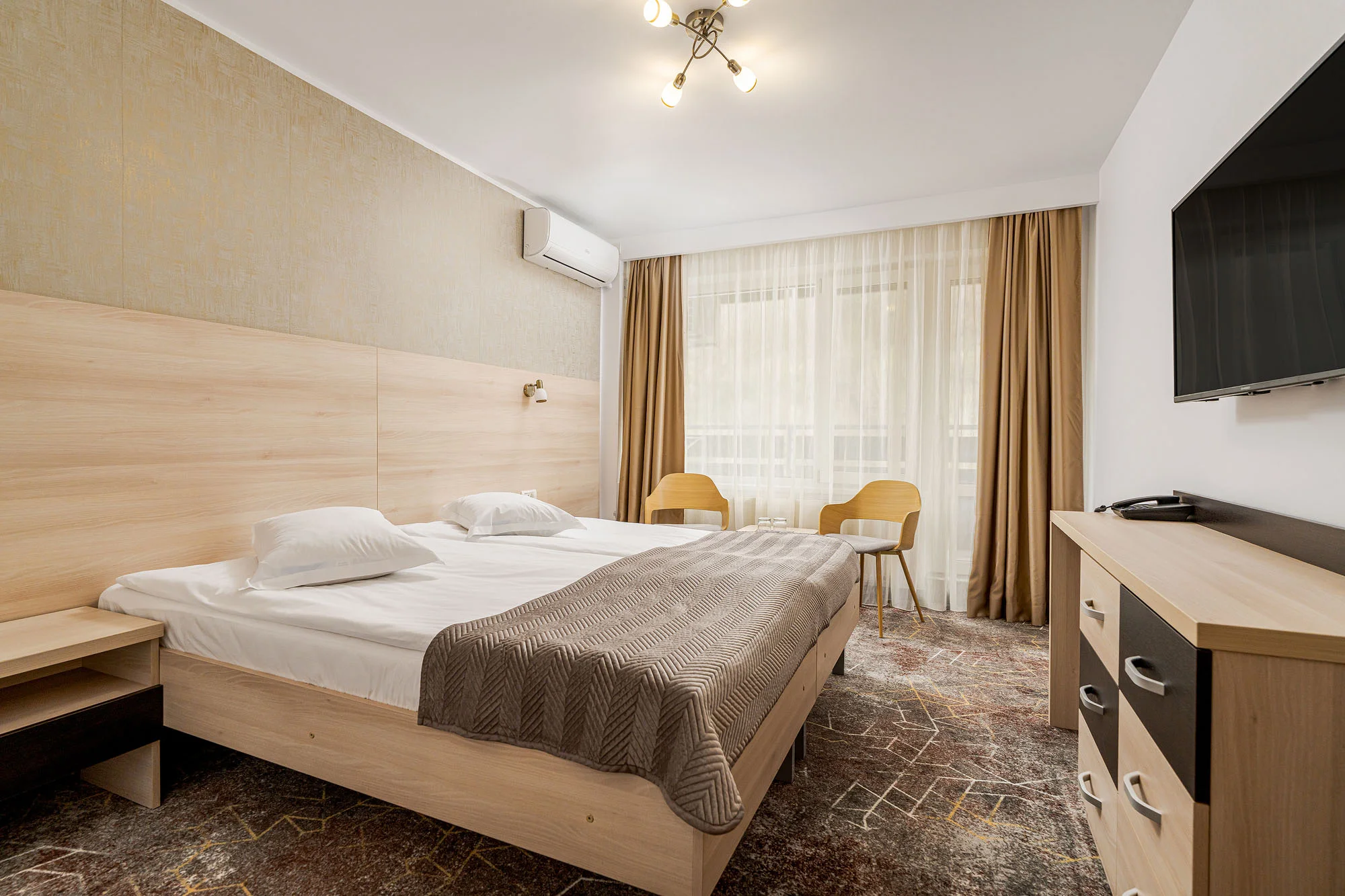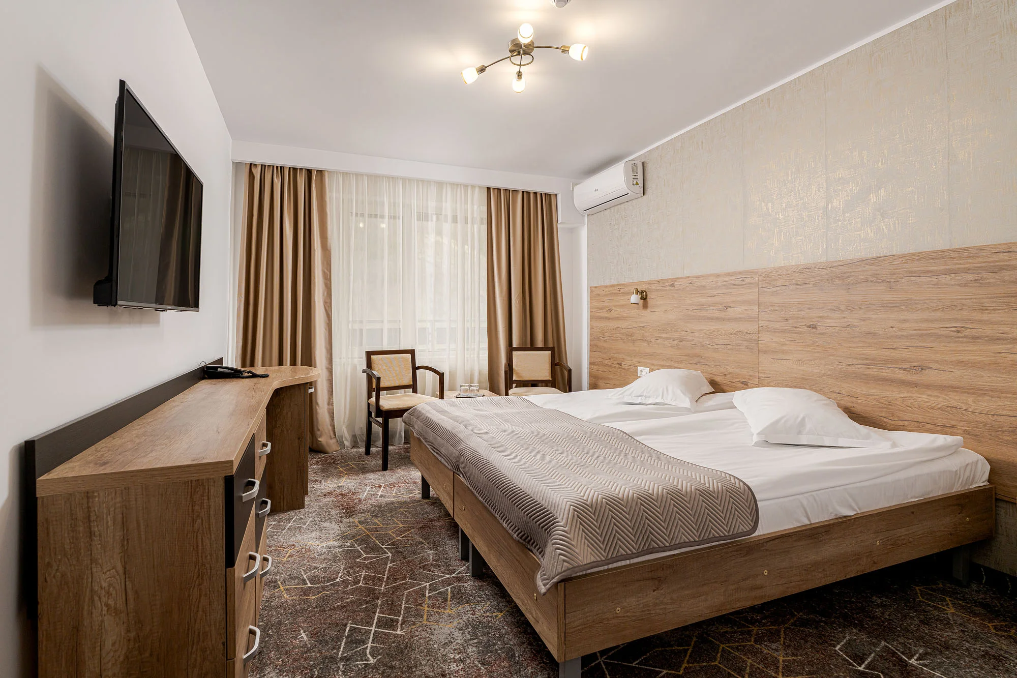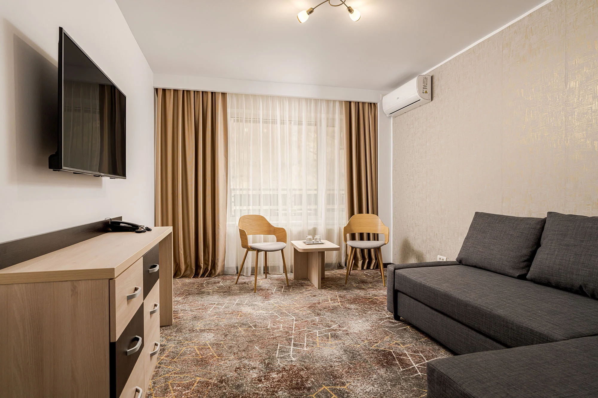 Camerele au fost reamenajate prin modernizarea finisajelor și a băilor, iar mobilierul existent a fost recondiționat și integrat într-un design actual, rezultând un spațiu mai confortabil și funcțional.